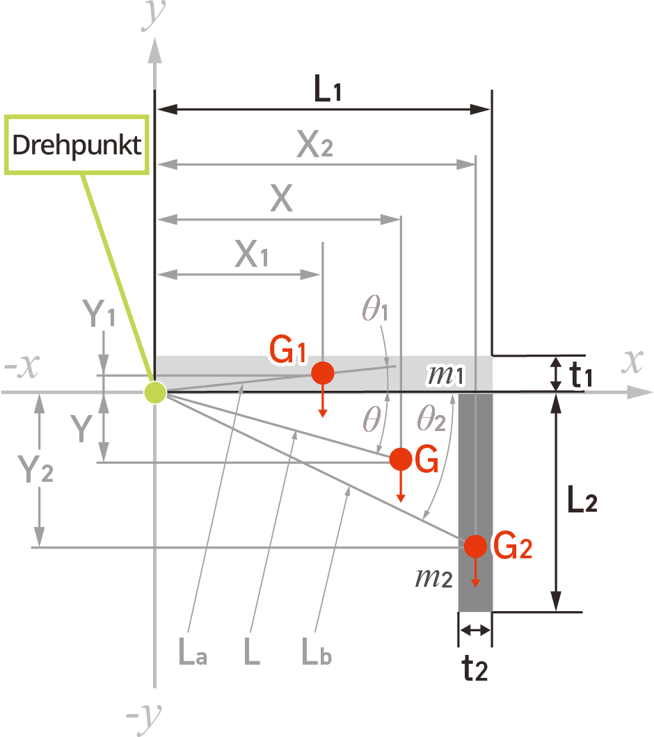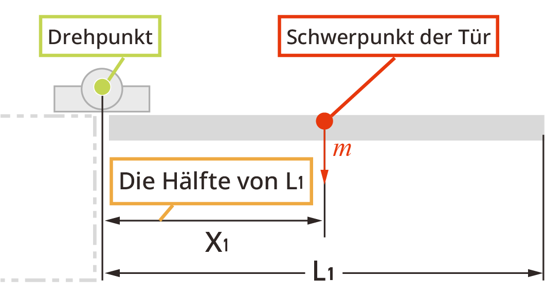 Wie in der Abbildung dargestellt, liegt der Schwerpunkt bei einer gleichmäßig geformten Klappe oder einer Tür in der Mitte. Das heißt, X1=L1÷2.