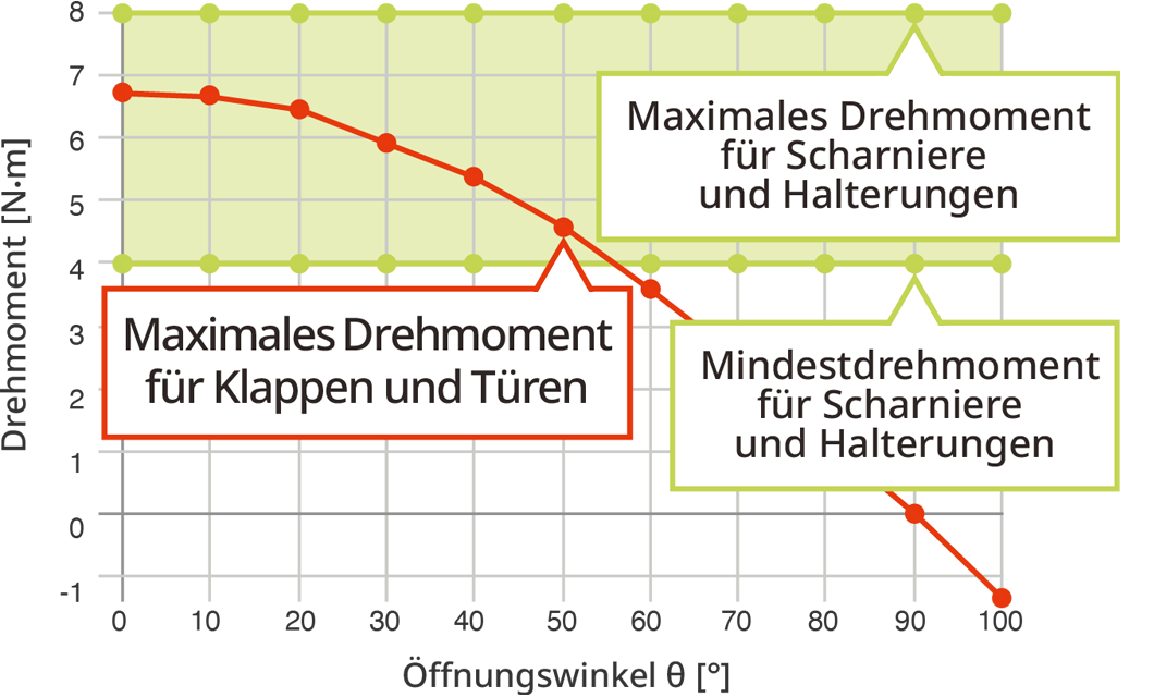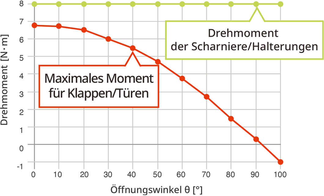 - Je näher das Moment der Klappe/Tür und das Drehmoment von Scharnier und Halterung beieinander liegen, desto leichter ist die Bedienung. Daher sollten sie möglichst nahe beieinander liegen.