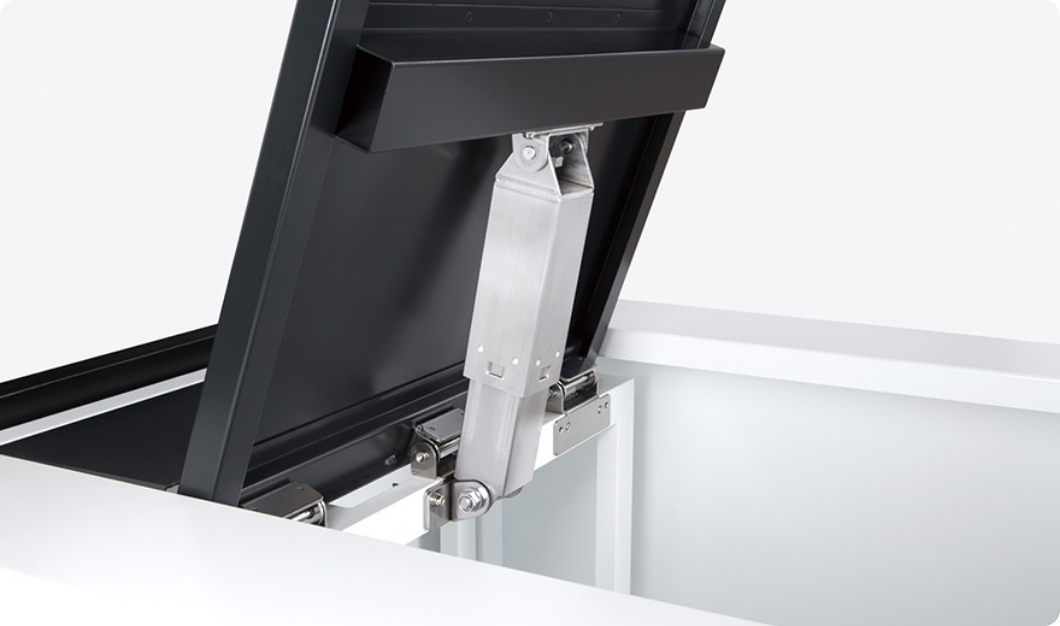 Dank der integrierten Hebeunterstützung lassen sich auch schwere Deckel leicht öffnen. Einige Produkte können mit einer optionalen Dämpfer-Einheit kombiniert werden, sodass sie sich langsam schließen.