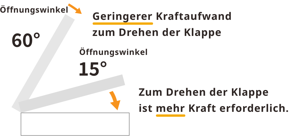 - Öffnungswinkel 60° : geringerer Kraftaufwand zum Drehen der Klappe erforderlich