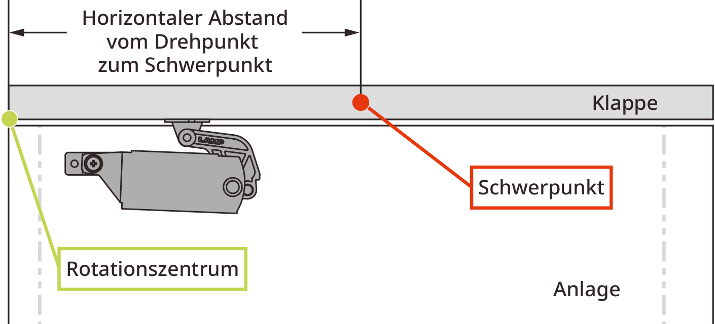 Damit sich die Klappe leicht öffnen lässt, muss der Drehmomentwert des Beschlags (die Kraft, mit der die Klappe angehoben werden soll) größer sein als das Drehmoment der Klappe (die Kraft, mit der die Klappe gedreht werden soll).