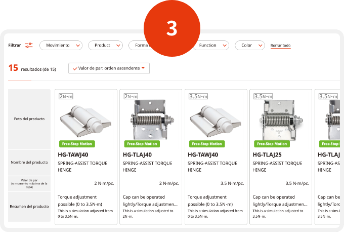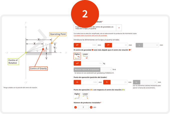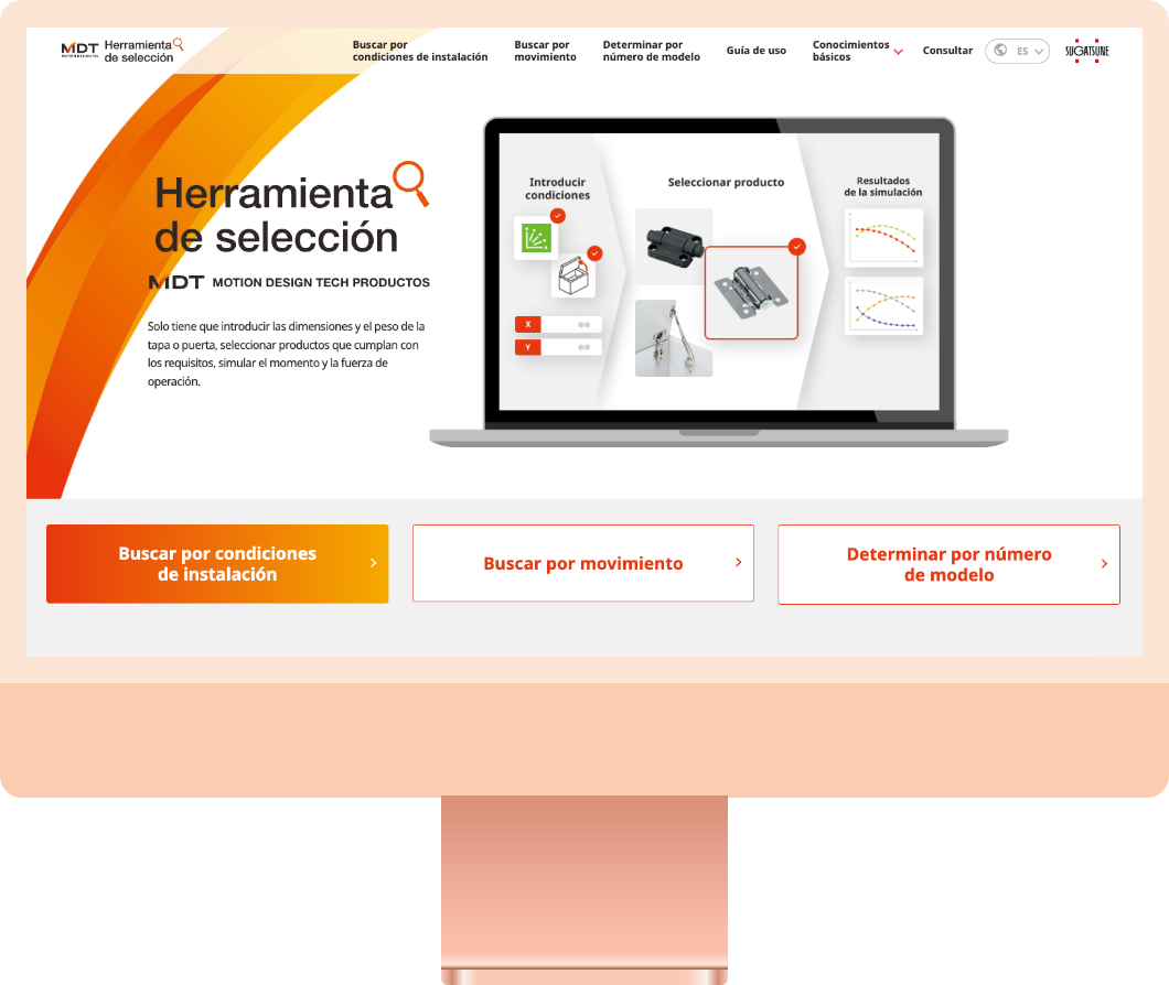 La herramienta de selección MDT permite seleccionar bisagras, soportes y otros productos adecuados a las condiciones especificadas introduciendo valores numéricos como las dimensiones y el peso de puertas y tapas, y simular el momento y la fuerza de accionamiento (mediante gráficos).