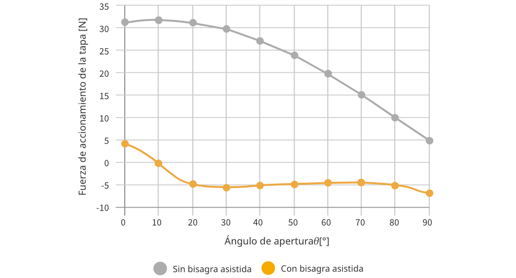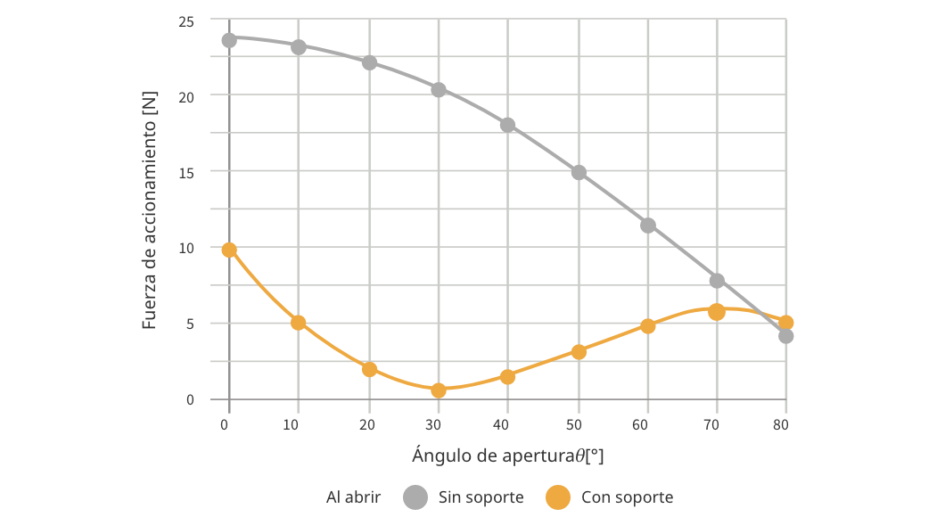 Fuerza necesaria para abrir y cerrar puertas y tapas con bisagras y compases de fricción comunes