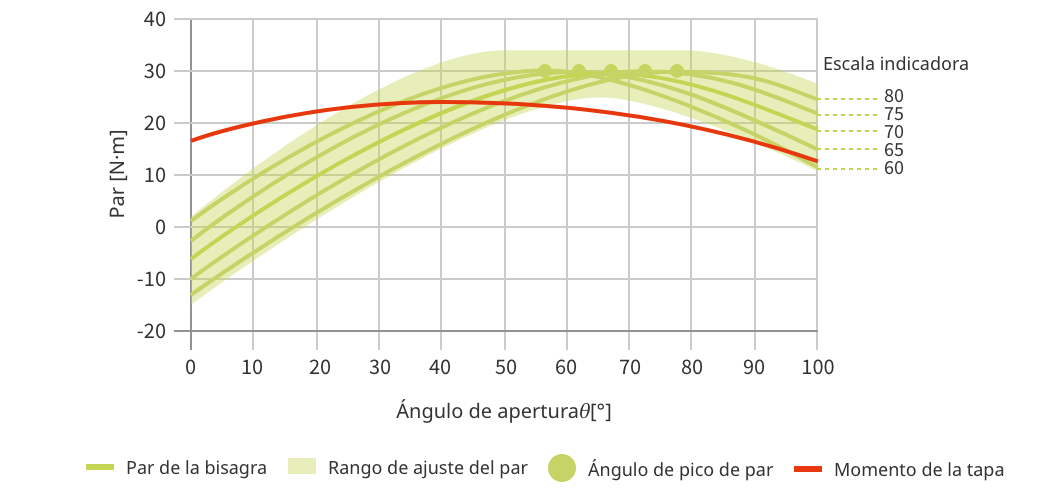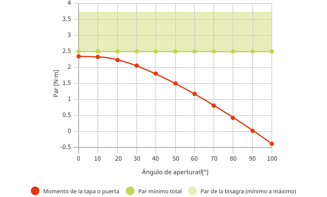 * Si en 0° el momento de la tapa es mayor que el par total de las bisagras, la tapa quedará «flotando», lo que dificultará su uso. Al tratarse de un producto con amortiguador incorporado, es preferible que el par total de las bisagras sea pequeño en torno a 0°.