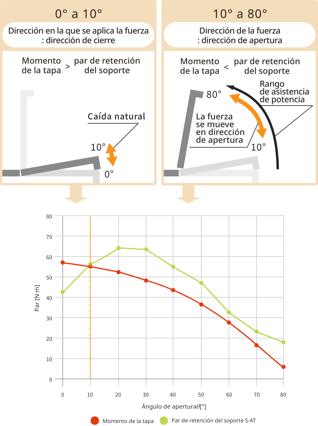 Dado que el par de retención del soporte S-AT es mayor, a partir de 10° la tapa no cae por sí sola.