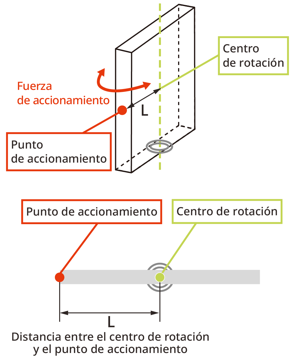 Fuerza de accionamiento = Valor de par ÷ Distancia horizontal entre el centro de rotación y el punto de accionamiento