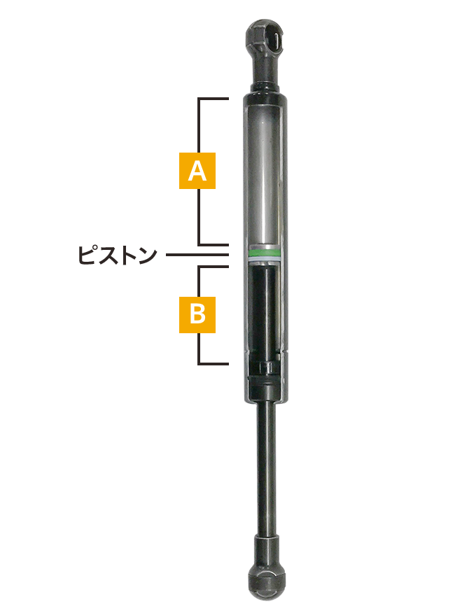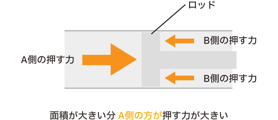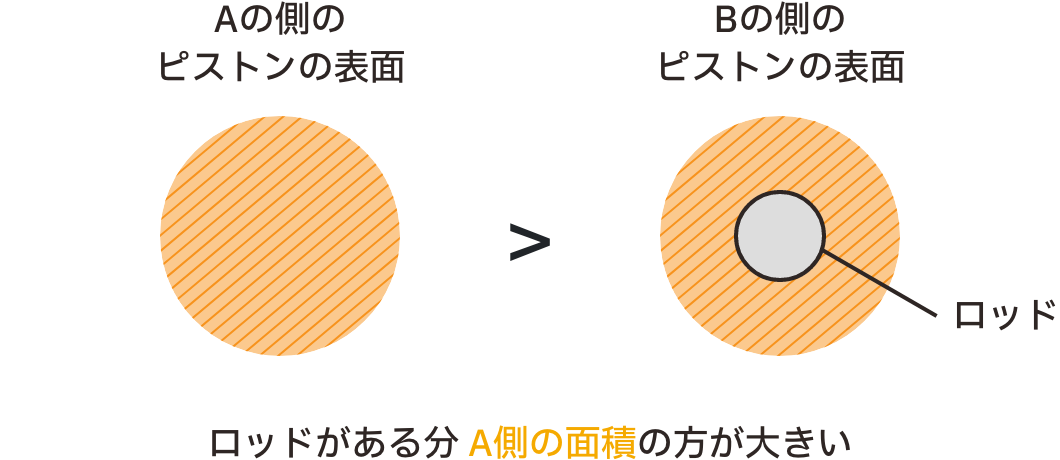 Bのロッドがつく分、面積が狭いことが分かります。そのため、ガスの力は同じですが、面積が広い分、Aのほうが押す力は強くなります。そのためピストンは、常にロッドがあるB側に押されるのです。