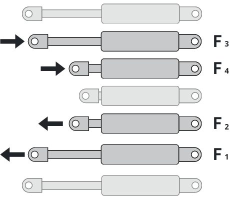 なお、ガススプリングを選ぶときは、ロッドが完全に伸びる5ミリ手前の力、一番弱くなるF1を基準に考えます。