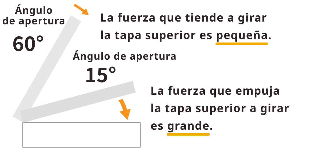 - Ángulo de apertura de 15°: la fuerza que intenta girar la tapa superior es grande