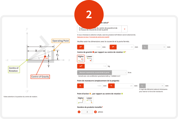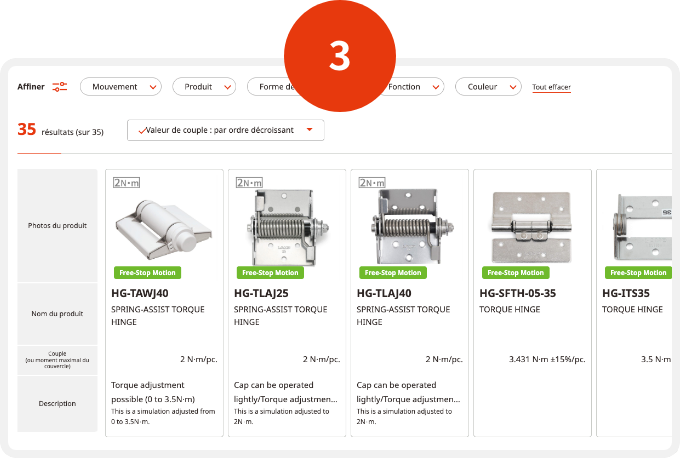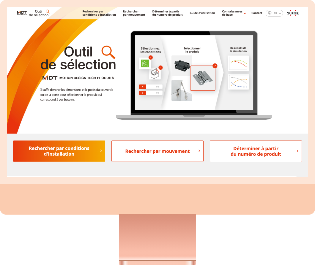 Outil de sélection MDT est un outil qui permet de sélectionner des produits tels que des charnières et des compass adaptés à vos besoins en saisissant des valeurs telles que les dimensions et le poids des portes et des couvercles, puis de simuler le moment et la force de manœuvre (affichage sous forme de graphe).