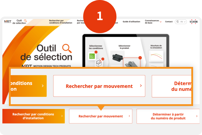 Choisissez l'une des trois méthodes de sélection suivantes : « Rechercher par conditions d'installation », « Rechercher par mouvement » ou « Déterminer à partir du numéro de référence ».