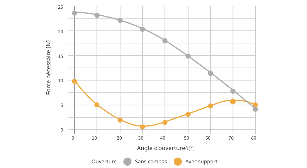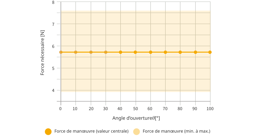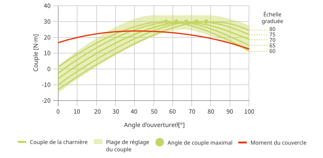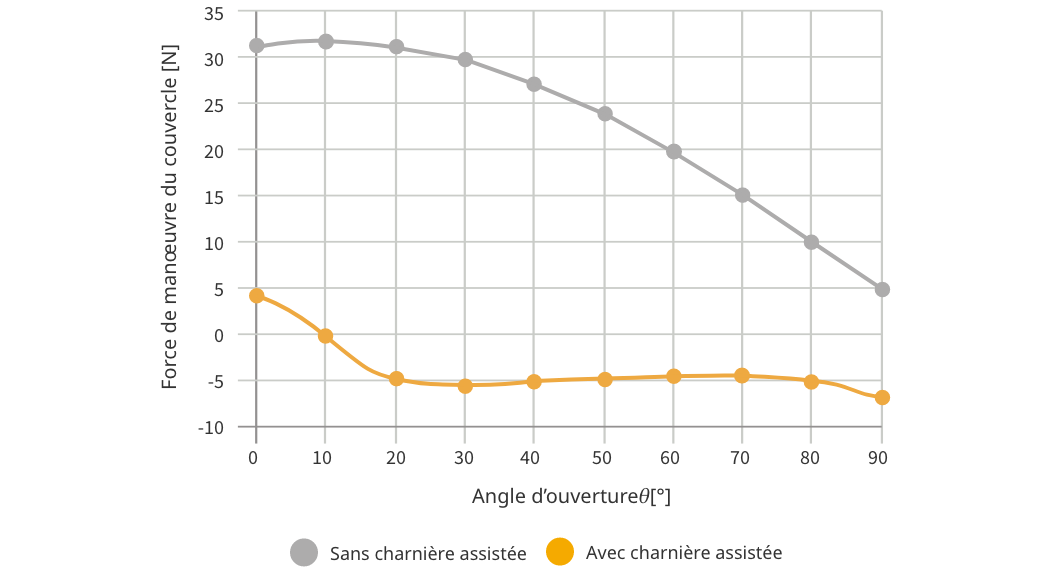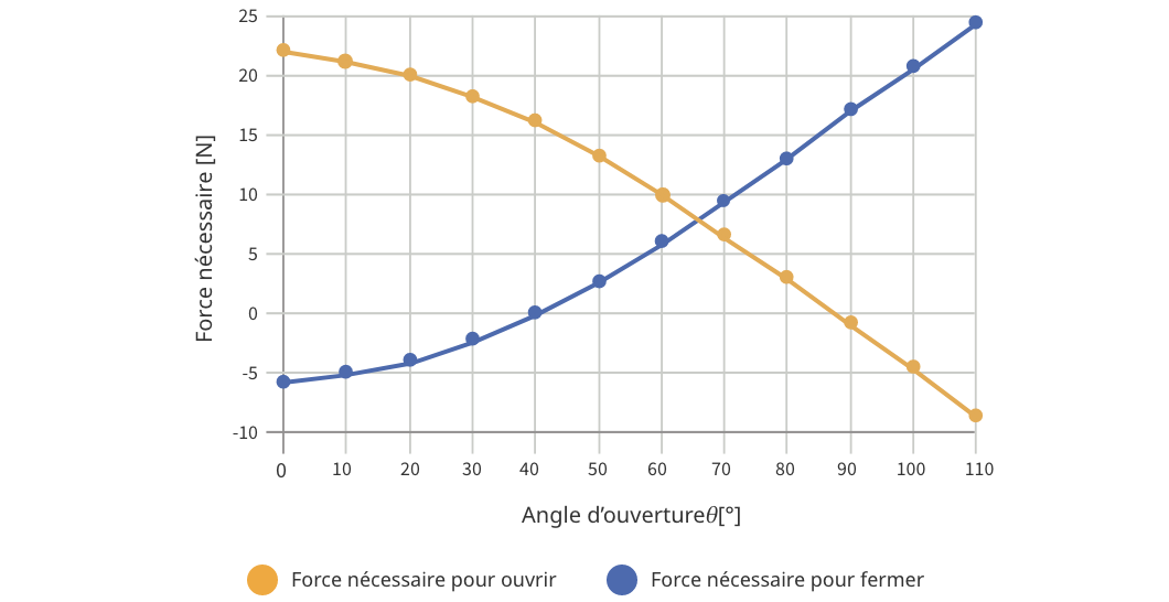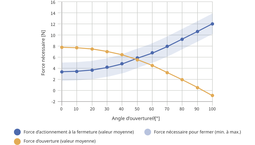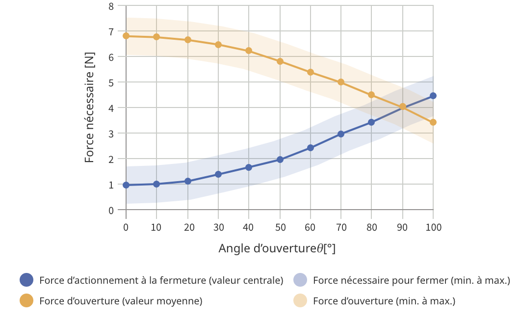 Force nécessaire pour ouvrir les portes et les couvercles équipés de charnières à couple et de barres à couple courantes