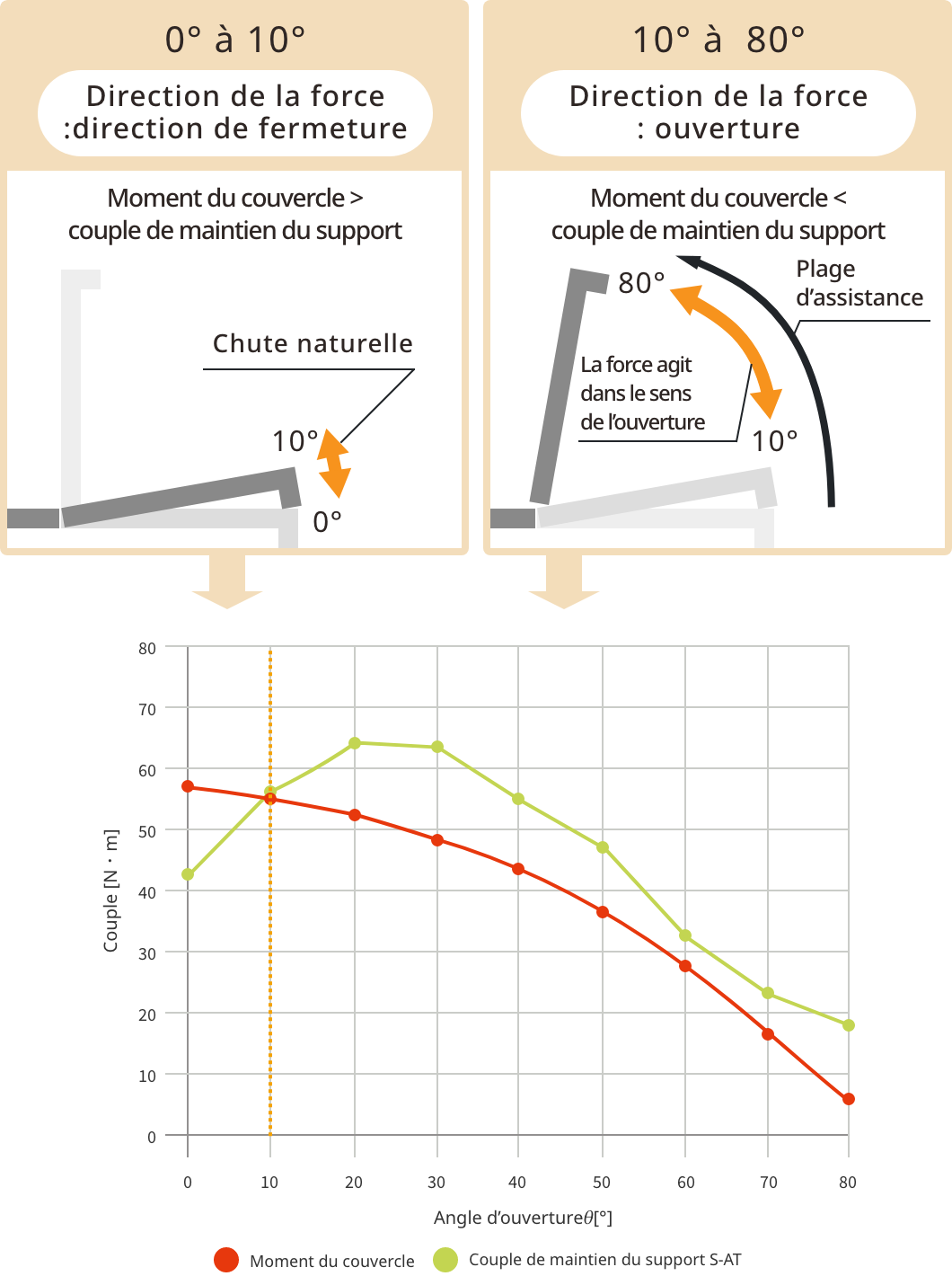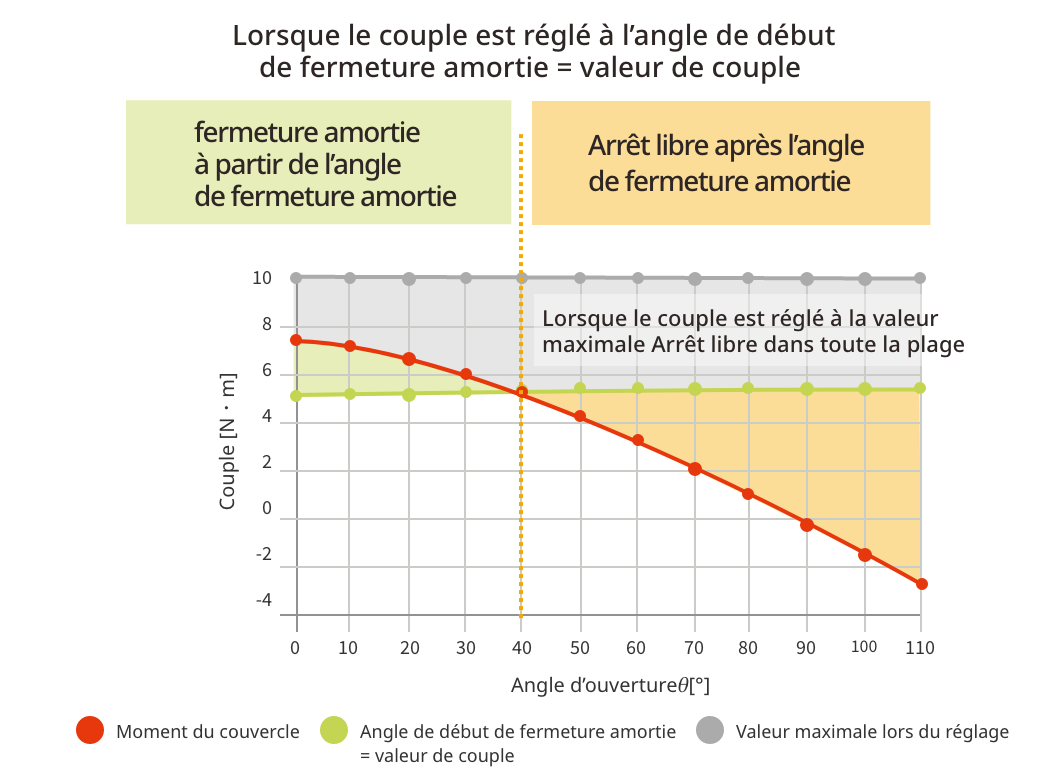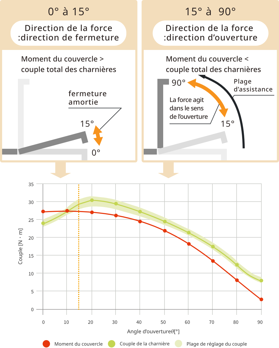 * Cependant, même si le couple total de la charnière est supérieur, si la différence est trop importante, le couvercle s'ouvrira naturellement. Il est donc préférable que la différence soit faible, comme le montre le graphe de gauche.