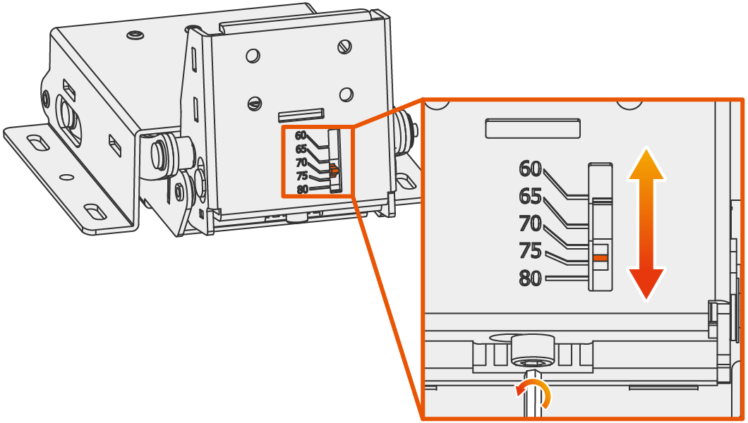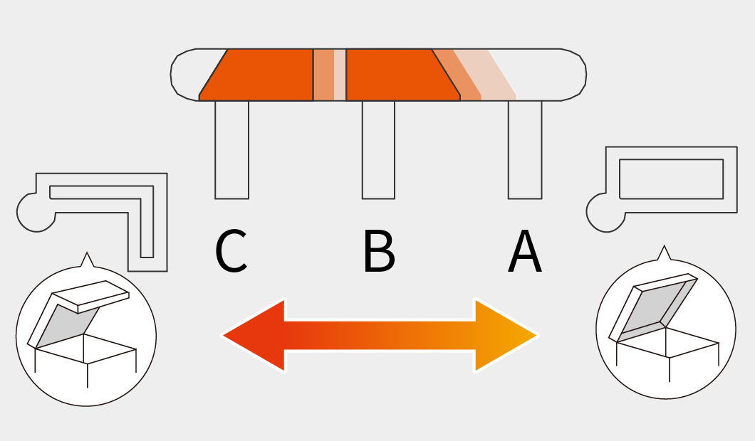 Plus la position de réglage est proche de A, plus le centre de gravité (par exemple, dans le cas d'un couvercle en forme de boîte) est élevé par rapport à l'axe de rotation. Plus la position de réglage est proche de C, plus le centre de gravité (par exemple, dans le cas d'un couvercle en forme de L) est bas par rapport à l'axe de