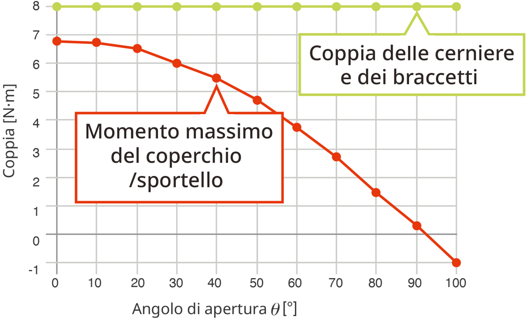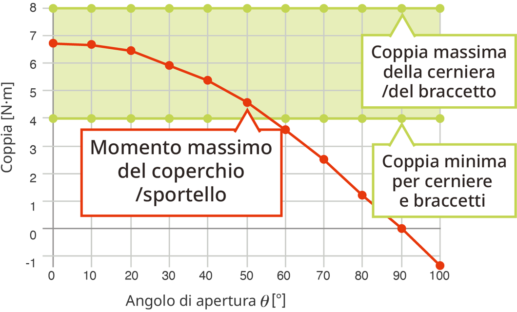 - È preferibile che i valori del momento del coperchio/portello e la coppia della cerniera/del supporto sono simili; l'azionamento risulterá più leggero.