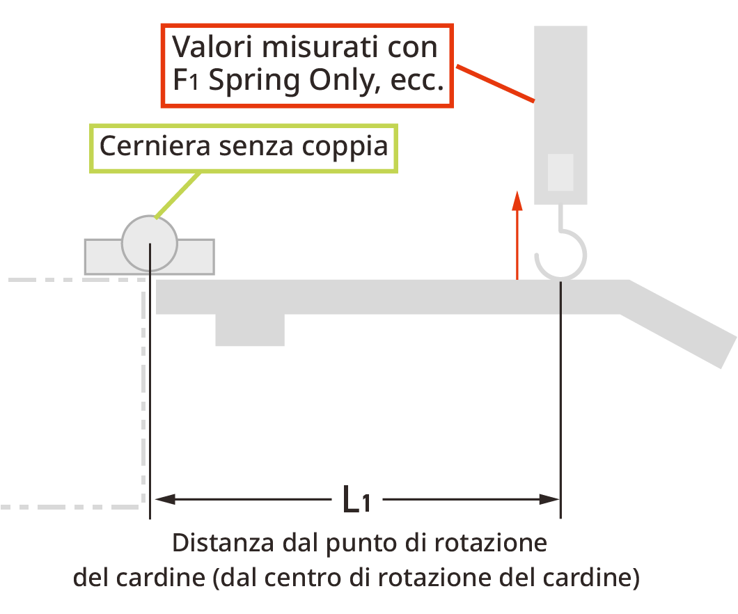 Come mostrato in figura, sollevare il coperchio o lo sportello solo con la molla e misurare il "valore massimo" e la "distanza dal centro di rotazione al punto di misurazione".